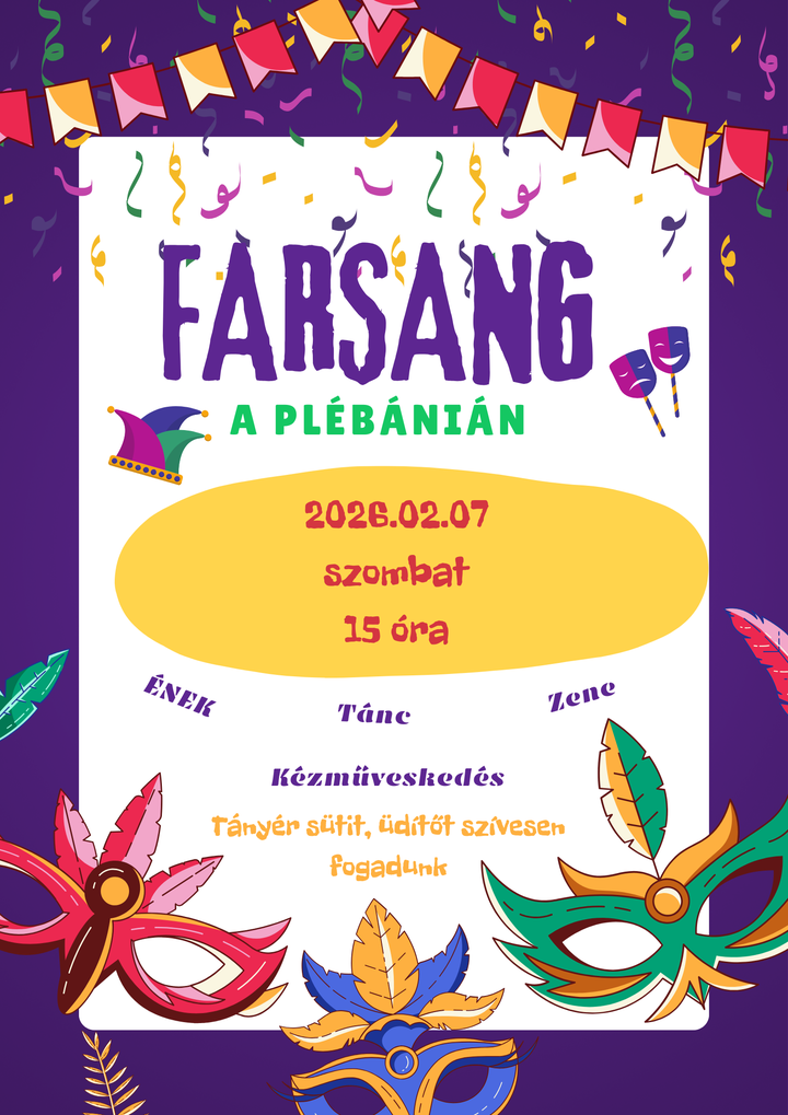 Sok szeretettel várjuk egyházközségünk gyermekeit farsangi mulatságra a plébániára.