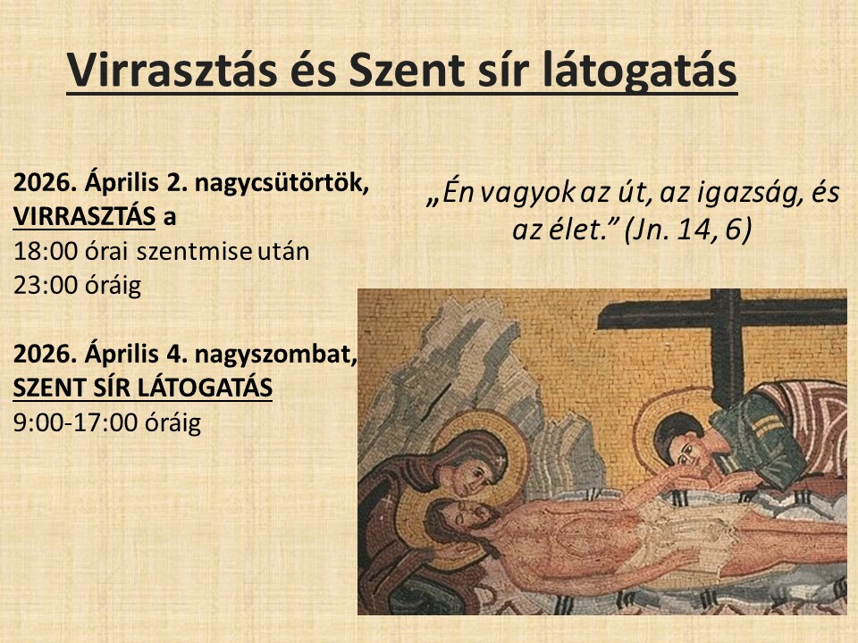 A Húsvéti ünnepek mélyebb megélése, és hitünk, reményünk erősítése érdekében idén is lesz lehetőség virrasztásra és szent sír látogatásra.
